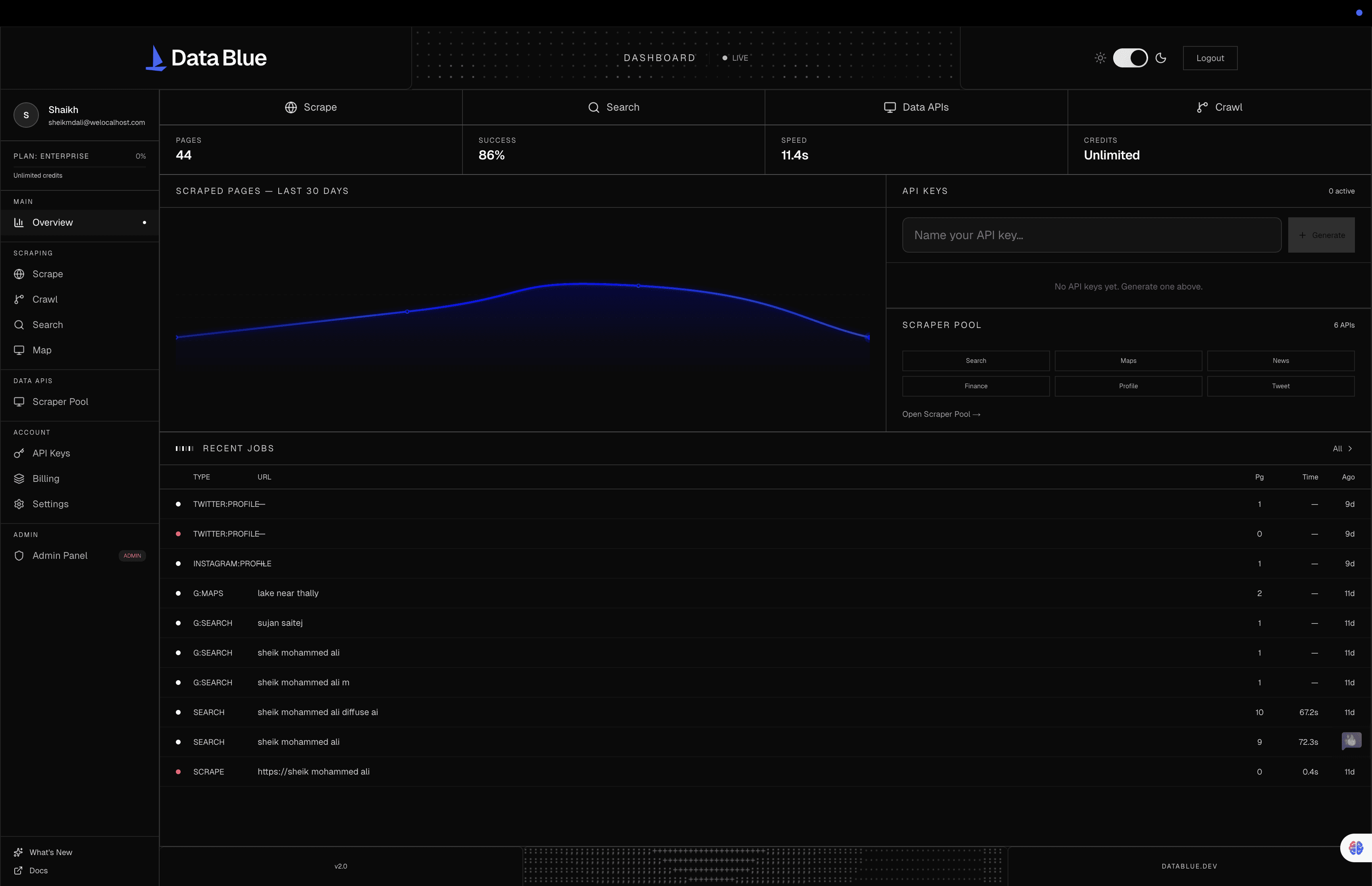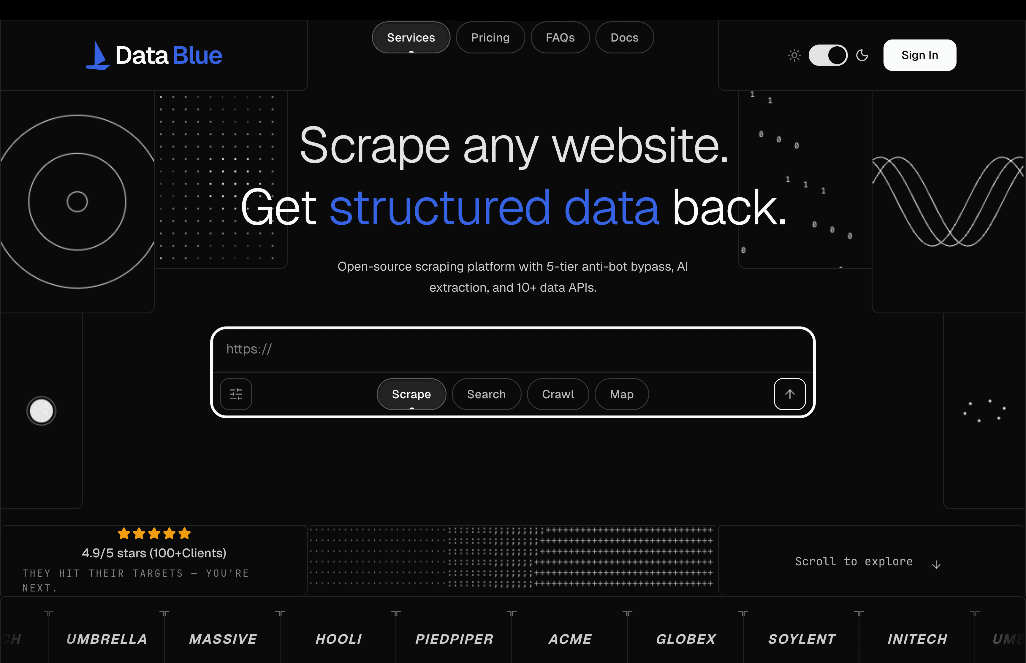 DataBlue is a web scraping and data extraction platform with 24+ APIs. You send a URL or a search query, and we return clean, structured data as markdown, HTML, JSON, or training-ready JSON.